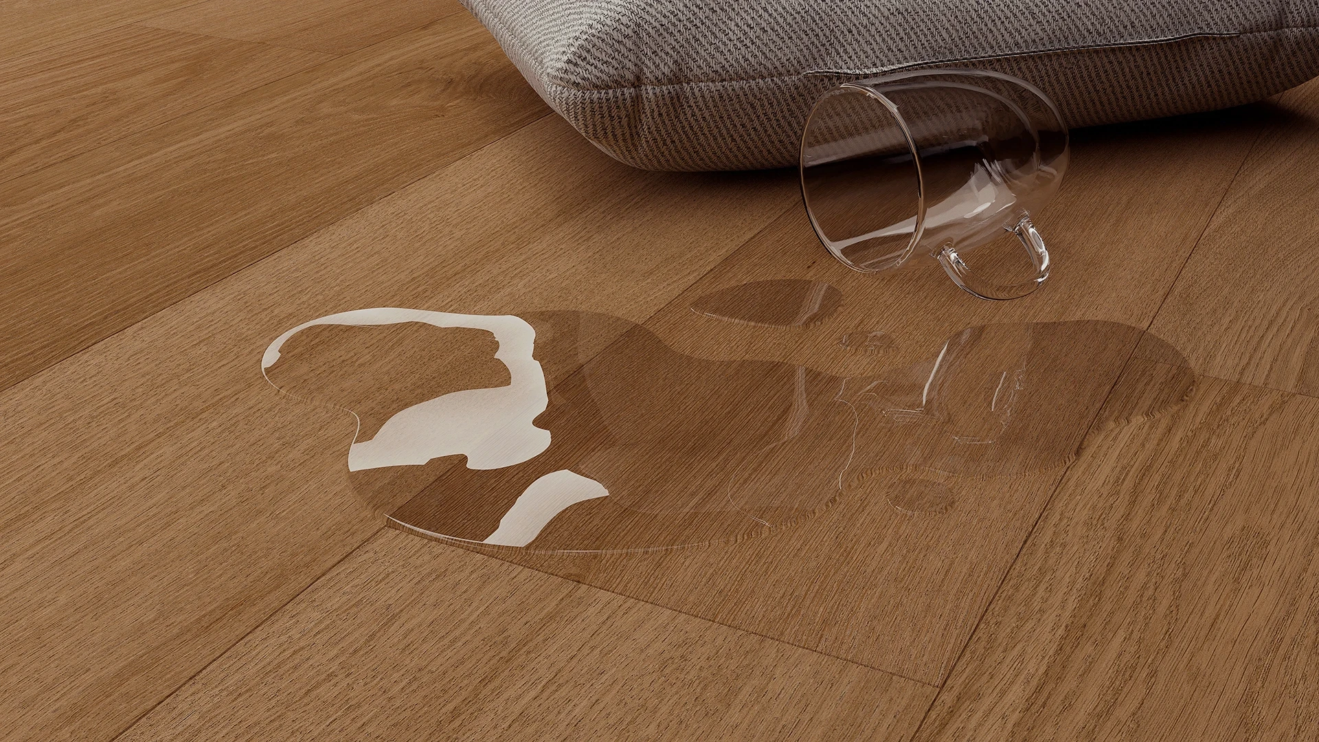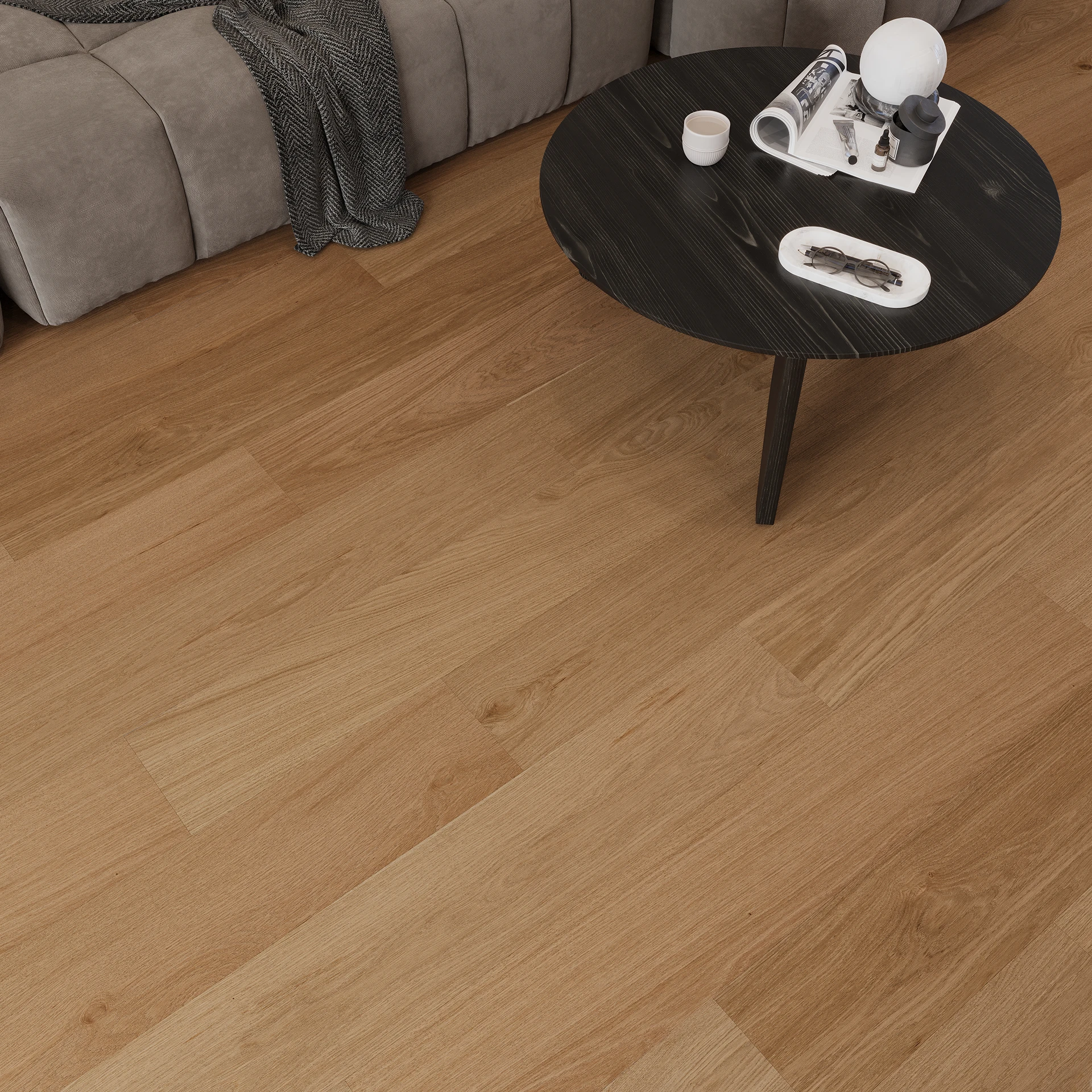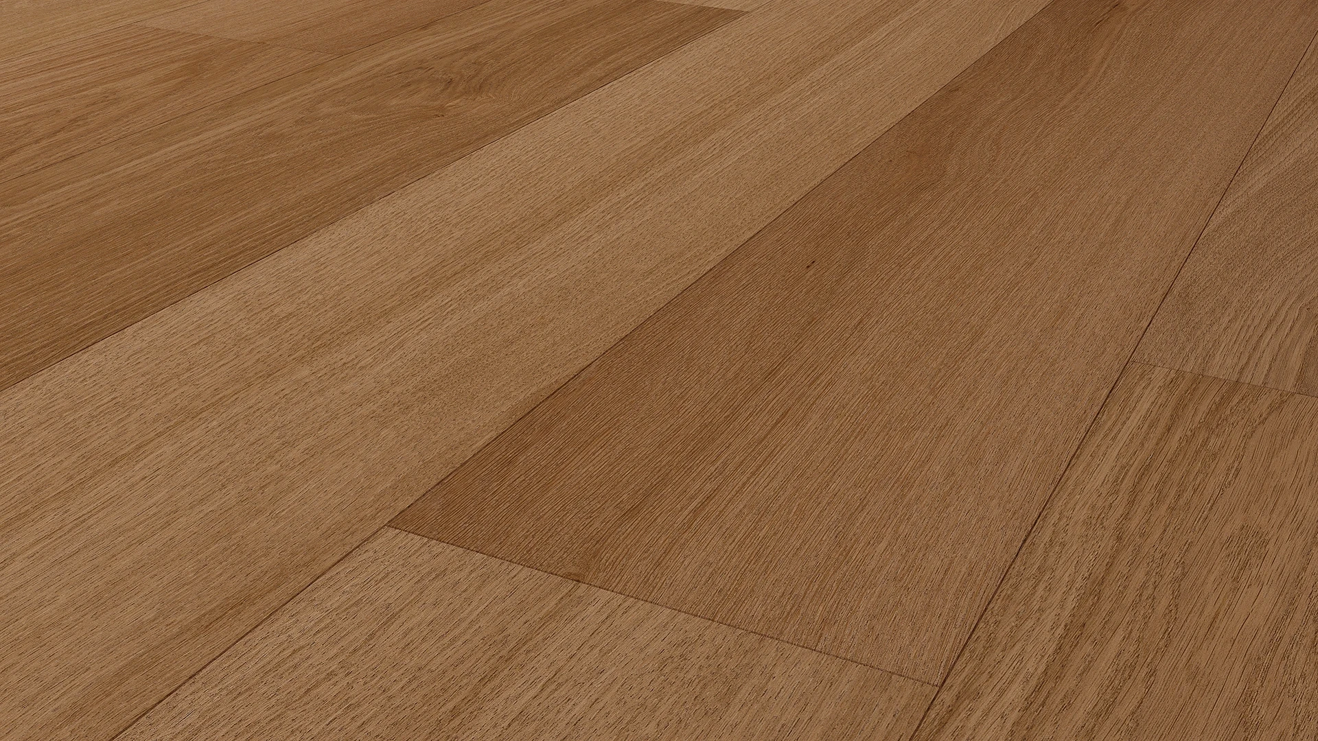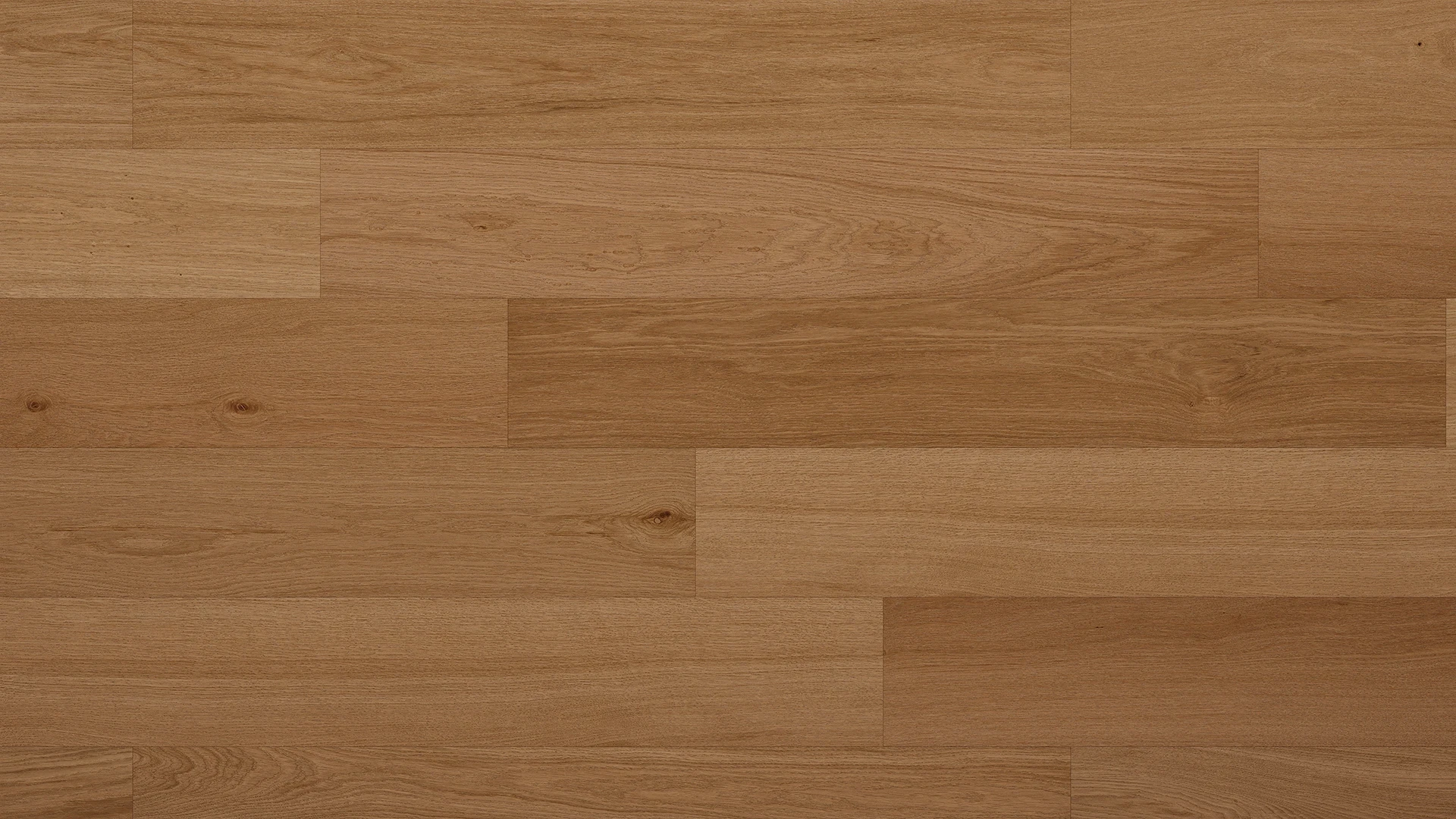 Дъбовата подова настилка в топъл, светъл нюанс на кафяво внася в интериора естествен и уютен климат. Леко потъмненото дърво подчертава характера на дъба и неговата деликатна шарка.